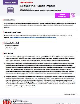 Unfortunately, human actions negatively impact Earth’s natural systems on a daily basis. To combat this problem, students will develop an action plan, complete with a catchy slogan, to reduce the human impact on natural systems.