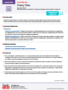 Students will participate in a Socratic seminar with peers to discuss poetry by two popular American poets. Student will examine the two works multiple times to develop discussion questions and make connections.